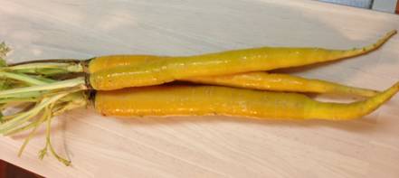 島にんじんは、東洋系の品種で、黄色く、30~40センチ程の細長い形をしています。見かけとは裏腹に、沖縄の方言で「チデーグニ」=「黄色い大根」と呼ばれています。昔は日本全国で栽培されていたようですが、現在では沖縄でのみ作られています。