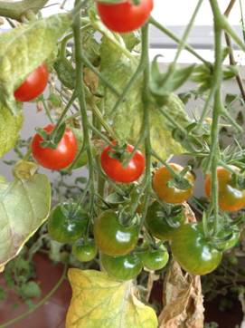 これから赤く色づいてくるミニトマトもあります。葉はみずみずしさを失っていますが、ミニトマト自体はみずみずしく張りもあります。このように全体の成長は止まっているもののミニトマトはしっかりとしたものが実っています。まだまだ収穫できるように思います。