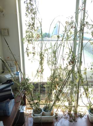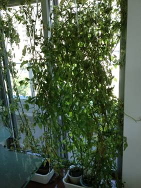 By contrast, the tomato plants in the picture above were still vigorous. They grew over the same period as the plants in the previous picture, but these plants grew in the unheated room during the cold season. They have grown slowly, but looked strong and are colored rich green, as you can see.